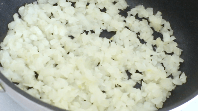 フライパンを温め、油を少量入れ塩少々し、玉ねぎを弱火でじっくり炒めます。