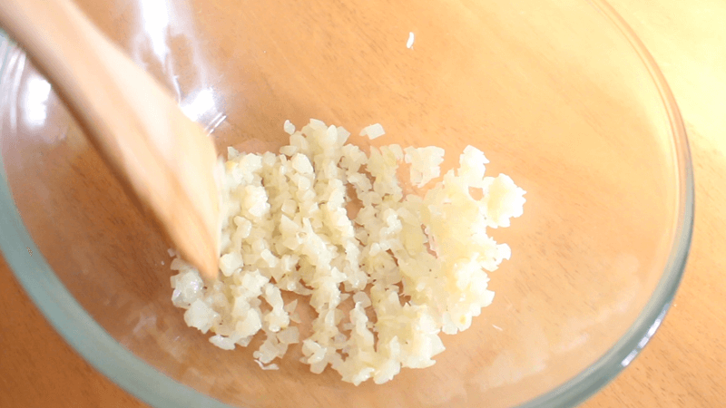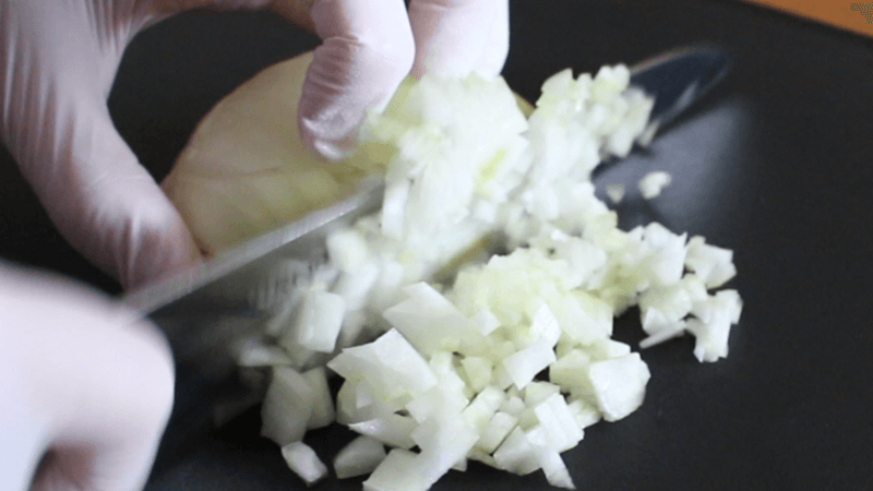 玉ねぎは皮をむき、縦半分にカットしてからみじん切りにします。