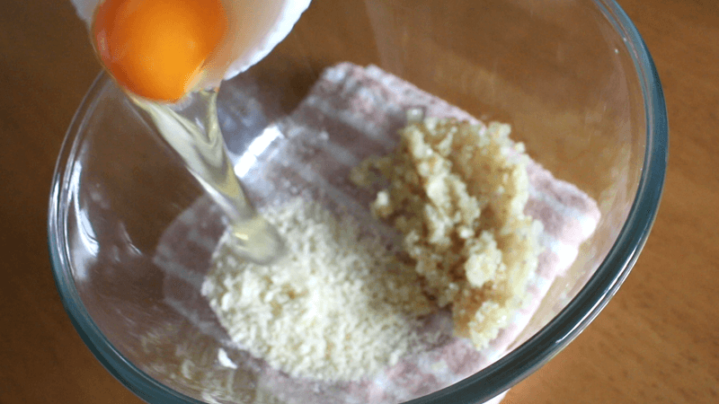 玉ねぎを端に寄せる。パン粉を入れ、その上から卵を割り入れる。