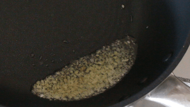 フライパンに油を入れ、弱火でにんにく・しょうがを炒めます。