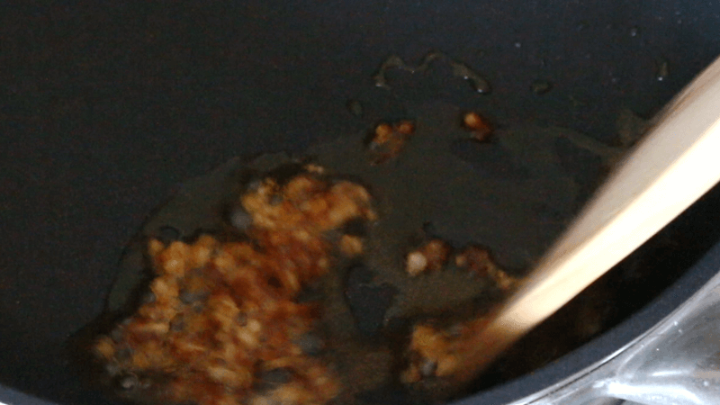 このタイミングで豆板醤を入れて炒めると、辛味とコクが油に出ます。