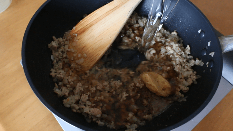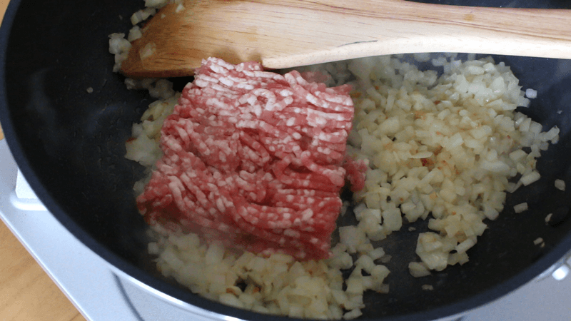 玉ねぎがしんなりしたらひき肉を入れ、色が変わるまで炒めます。
