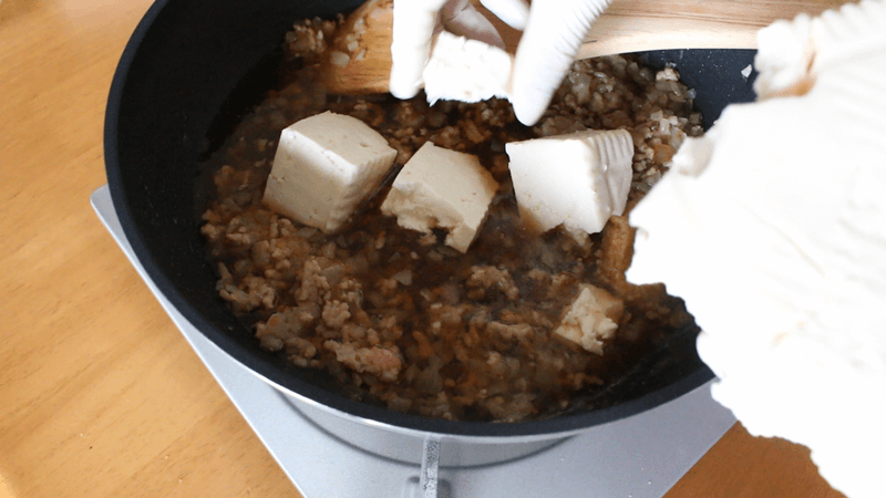 水切りした豆腐を手でちぎって入れます。