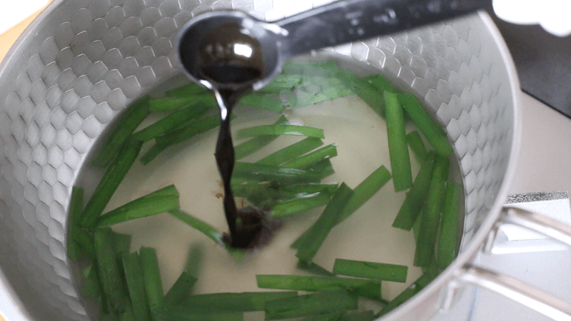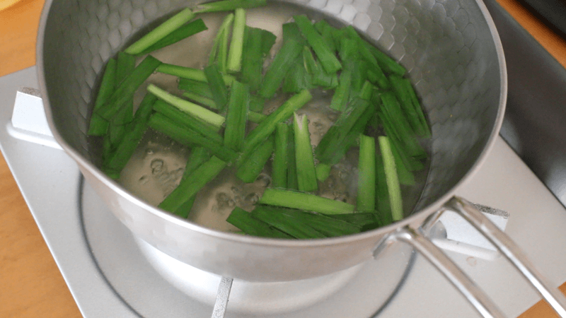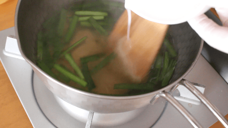 にらを加え、香りが出るまで軽く煮ます。