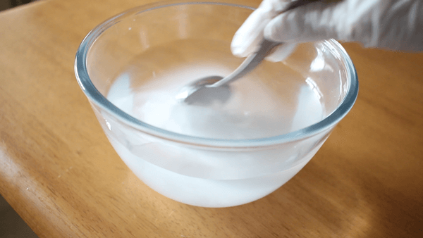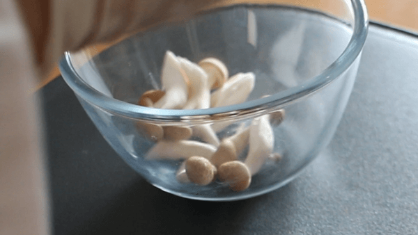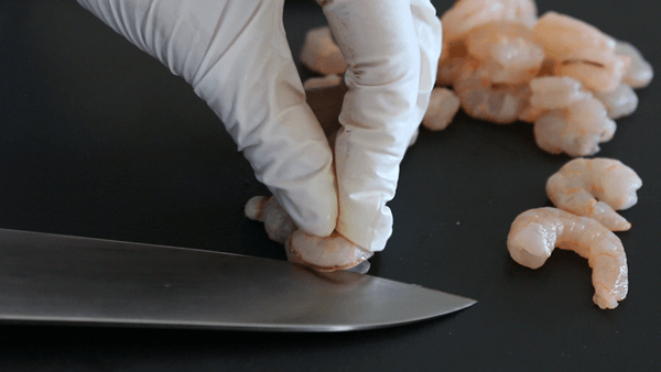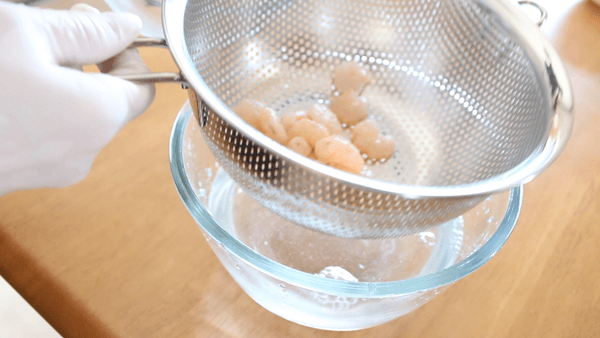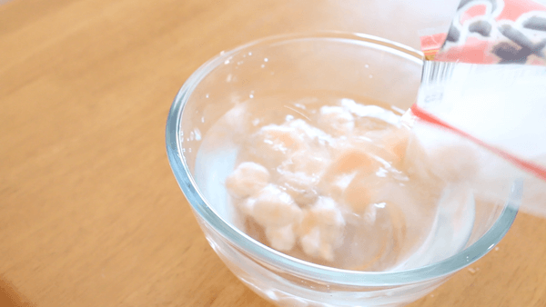 - 冷凍小エビ(100g)は塩水 (水500mlに対して大匙1) に入れて解凍