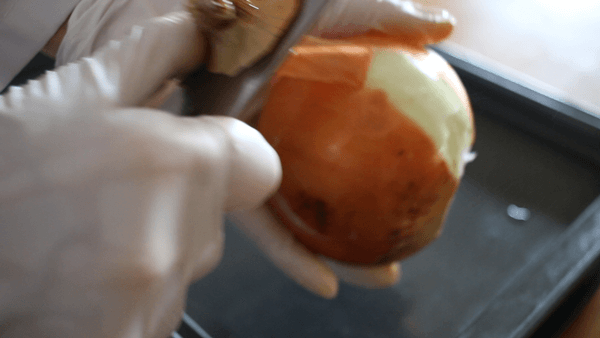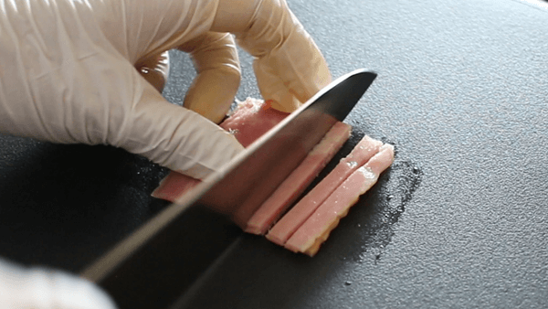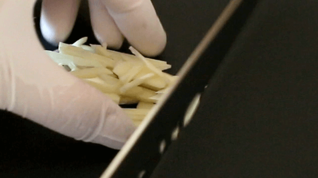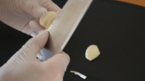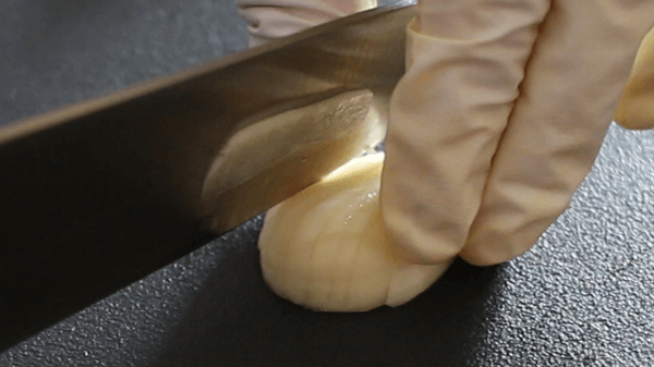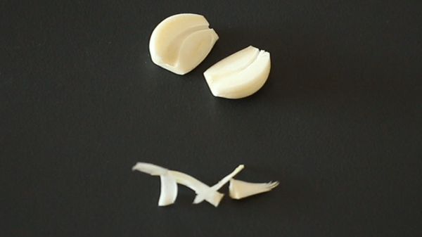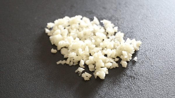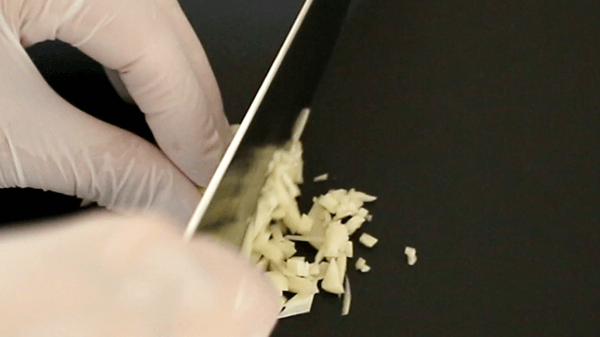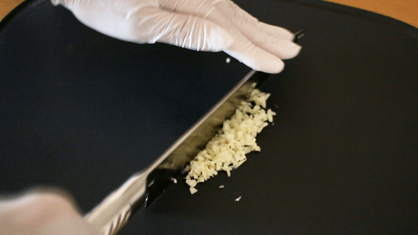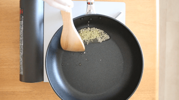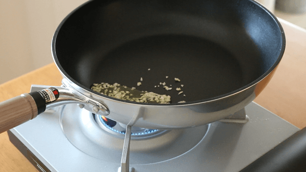 - フライパンに油とにんにくを入れ、弱火で香りを出す。