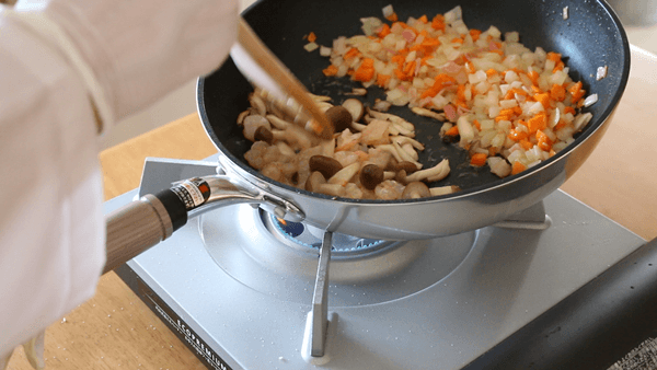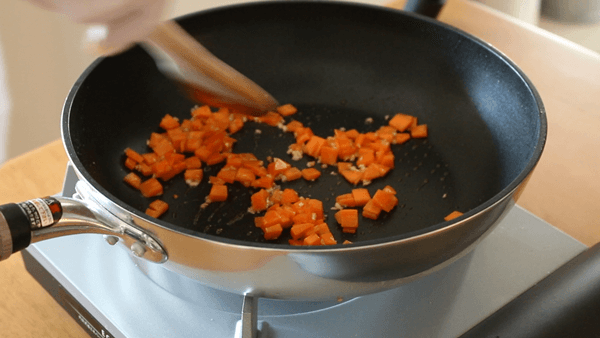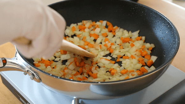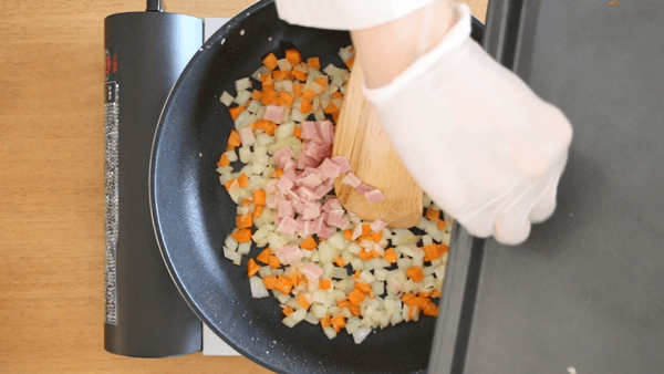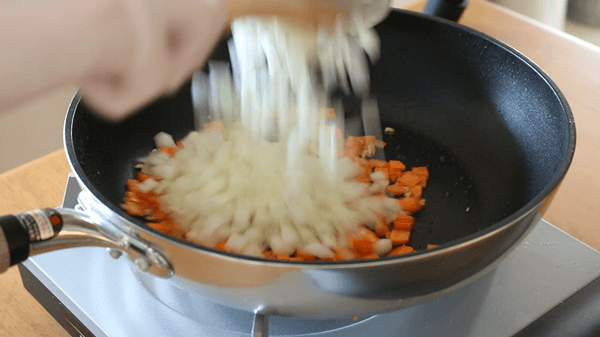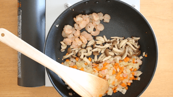 - 人参・玉ねぎ→ベーコン→しめじ→エビの順に炒め、火を通す。酒(あれば)少々・塩を振る