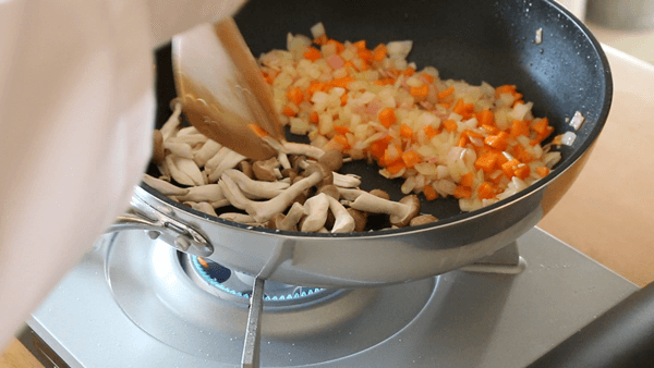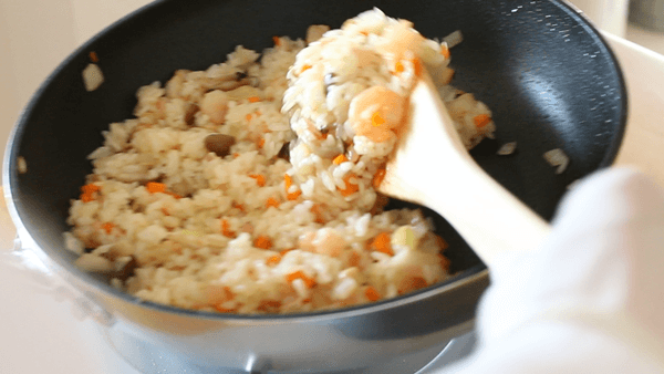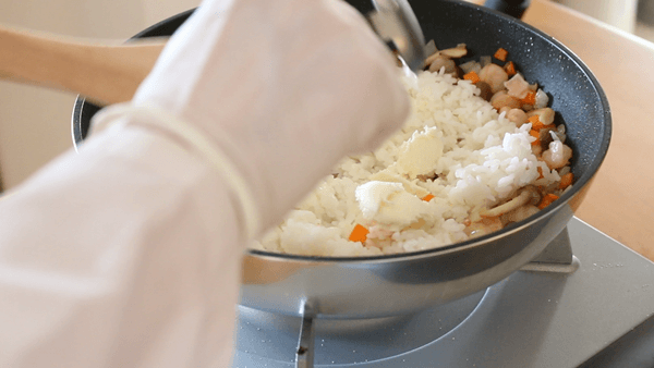 - ご飯を加えて炒め、バター・コンソメを絡める。